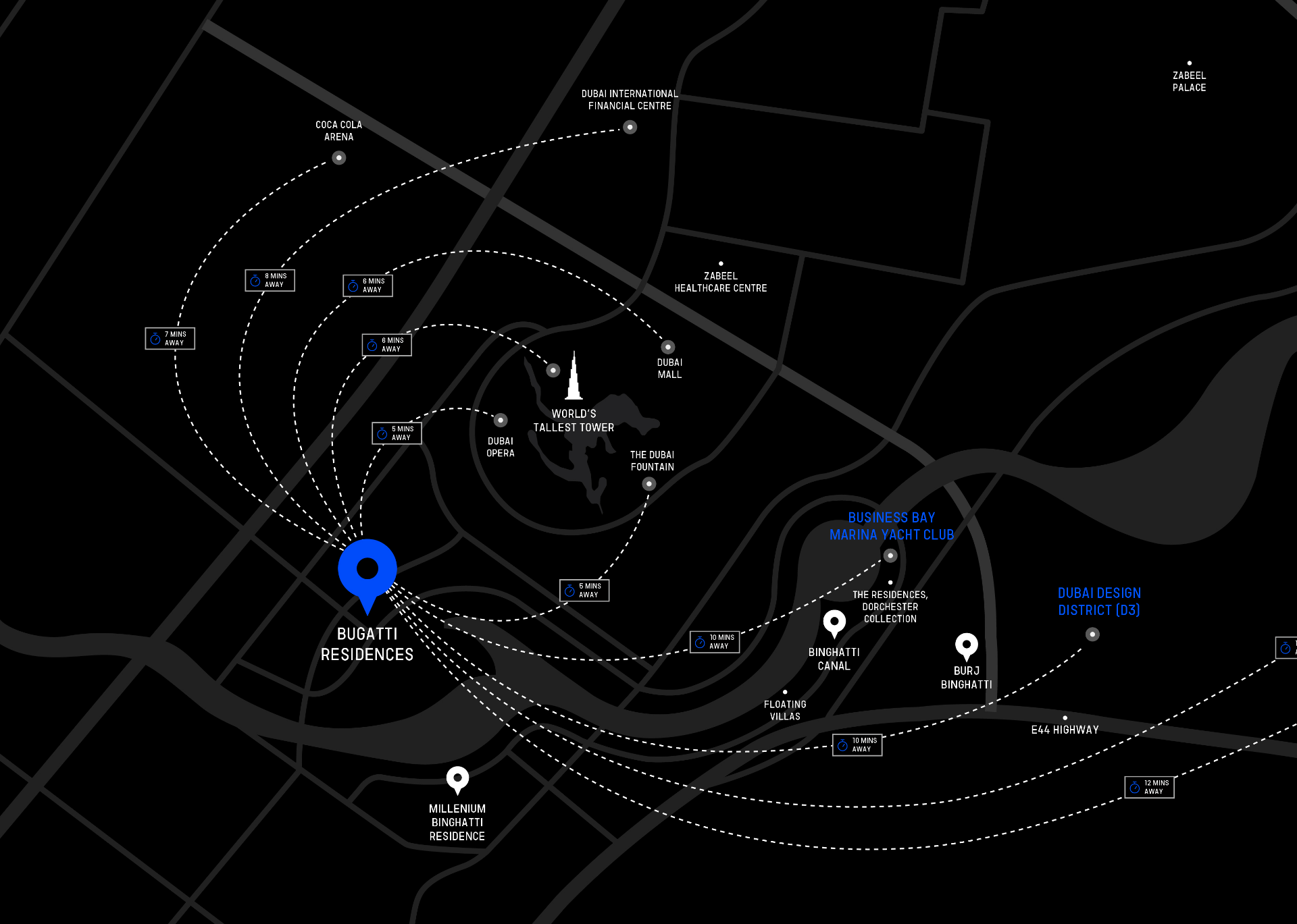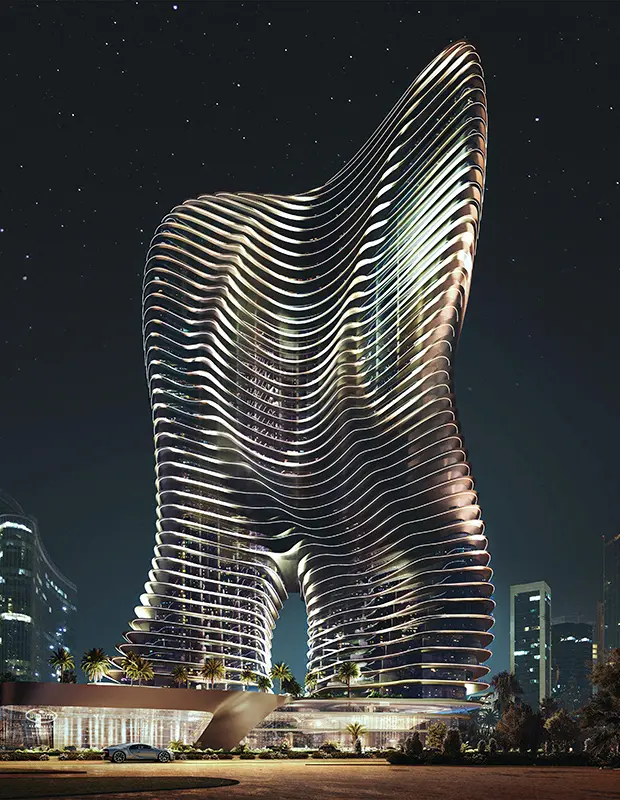 BUGATTI Residences by Binghatti wurde mit erfinderischer Lebendigkeit entworfen und strahlt pure Opulenz aus. Die Fassade zeichnet sich durch fließende Linien und subtile Kurven aus, die an die französische Riviera erinnern – ein vom Resort inspiriertes Wohnen im Herzen der Metropole.