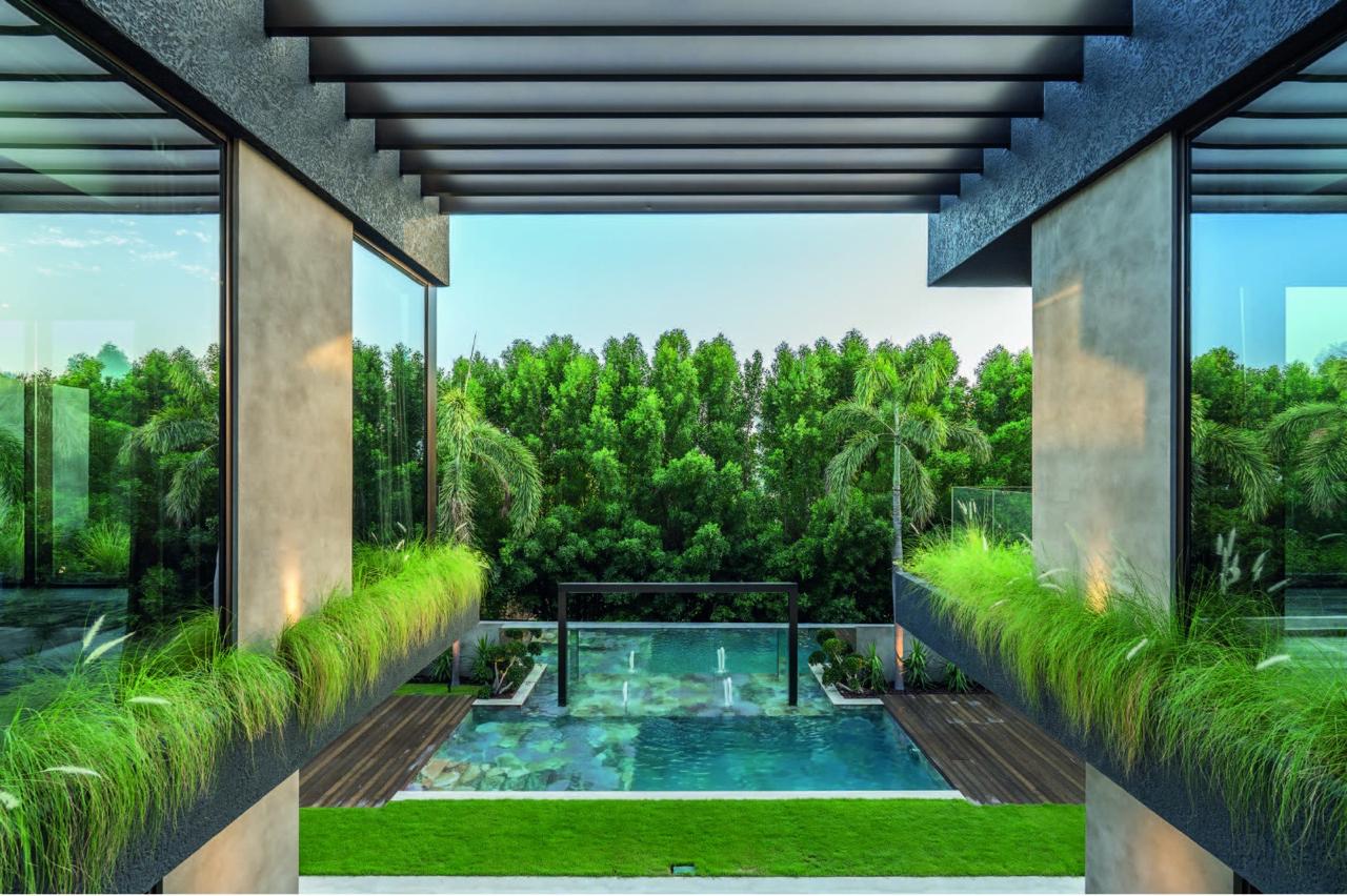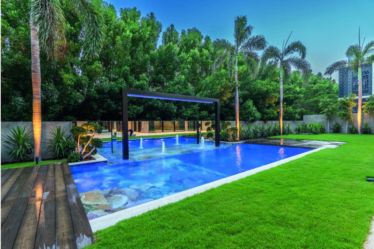 – **Eleganter Außenbereich**: Inklusive stilvollem Wasserfeature, das nachts zum Freiluftkino wird, und einem Pool mit Kühl- und Heizfunktion.